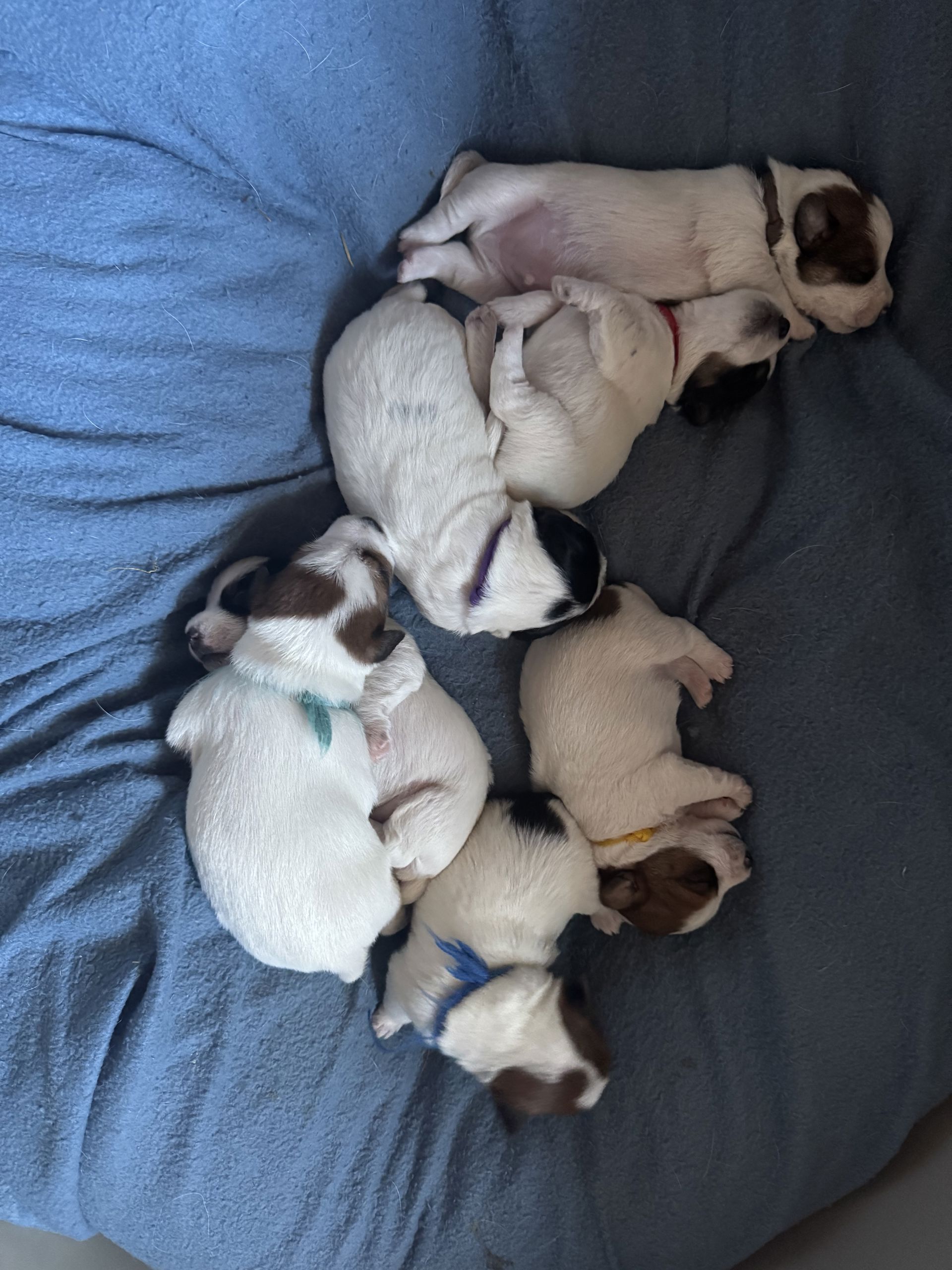 davon sind 4 Hündinnen und 3 Rüden in den Farben rot-weiss und tricolor, rauhaar und broken.